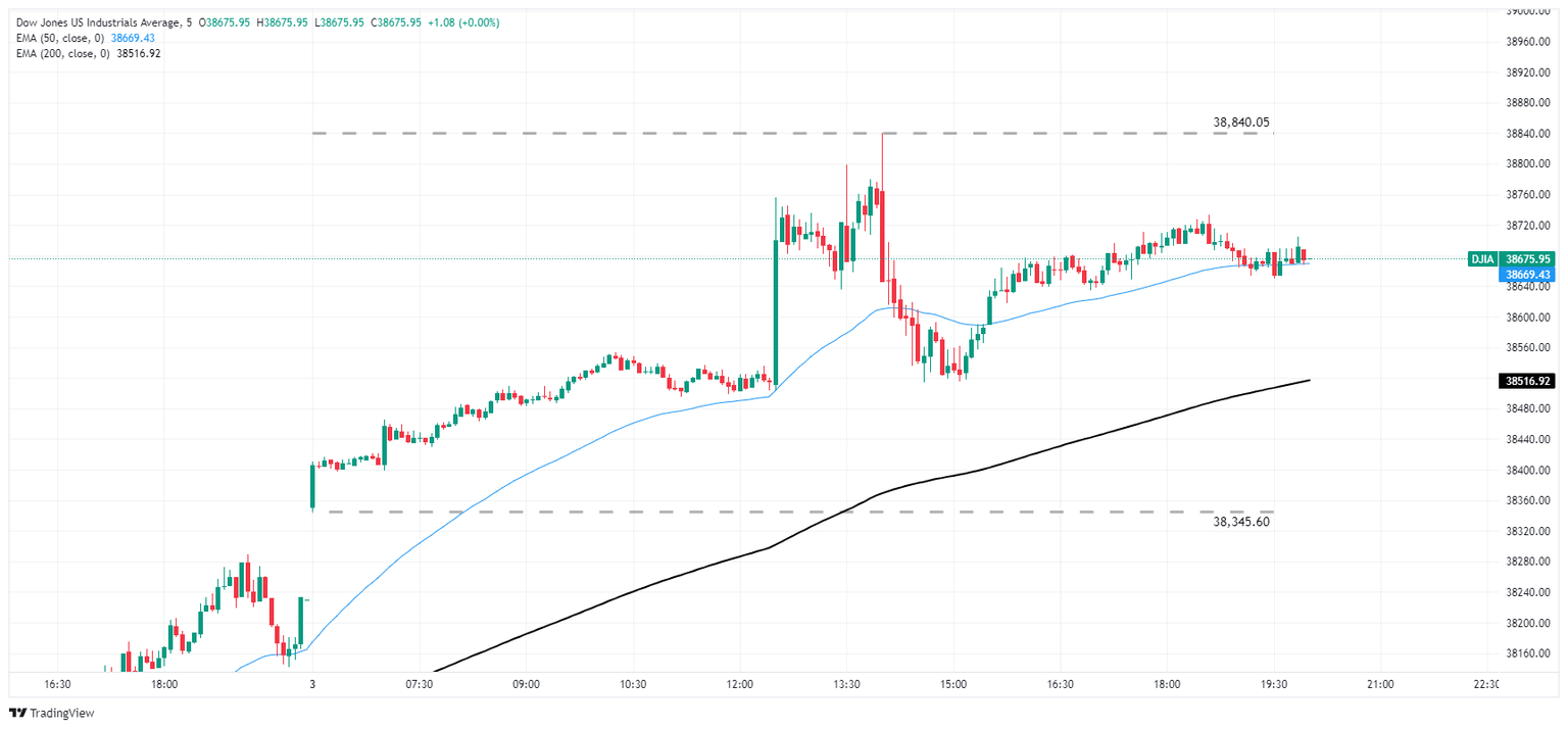 The Dow Jones Industrial Average climbed to an early session high of 38,840.05 after markets drove higher on the US’ latest NFP labor print, gaining ground from the day’s early low bids of 38,345.60. Equities are trading into the top half of the day’s price action as the DJIA looks to wrap up Friday near 38,800.00.