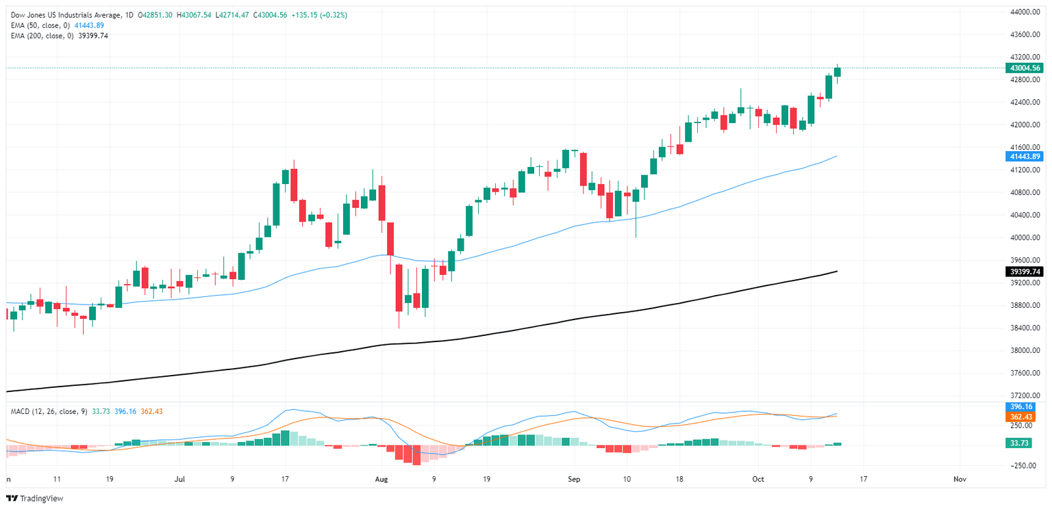The Dow Jones Industrial Average (DJIA) climbed to another record high on Columbus Day Monday, testing above the 43,000 handle and poised to enter a sixth consecutive week in the green. Wall Street is geared up for a hectic earnings reporting week, and this week’s US data docket is a smattering of mid-tier Federal Reserve (Fed) policymaker appearances with key US Retail Sales figures slated for Thursday.