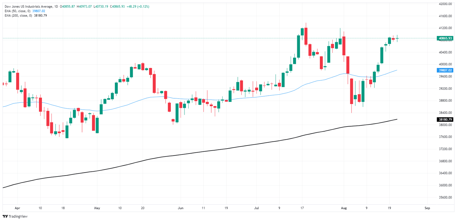 The Dow Jones Industrial Average churned in the midrange on Wednesday as markets buckle down for the wait to the kickoff of this year’s annual Jackson Hole Economic Summit on Thursday. Markets continue to look for firmer signs of the Federal Reserve (Fed) getting pushed into a rate cutting cycle in September, with bets on the rise of a 100 bps rate trim on September 18.