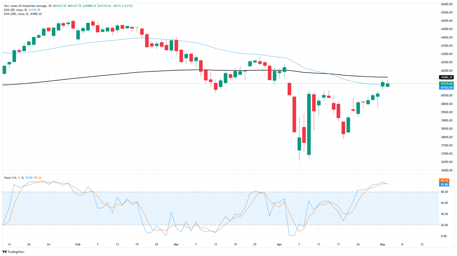 Monday’s cautious yet determined bullish push has inched bids even closer to the 200-day Exponential Moving Average (EMA) near 41,600. The Dow Jones has recovered nearly 9.5% from its April 21 low of 37,853, closing in the green for all but two of the last nine consecutive trading days.