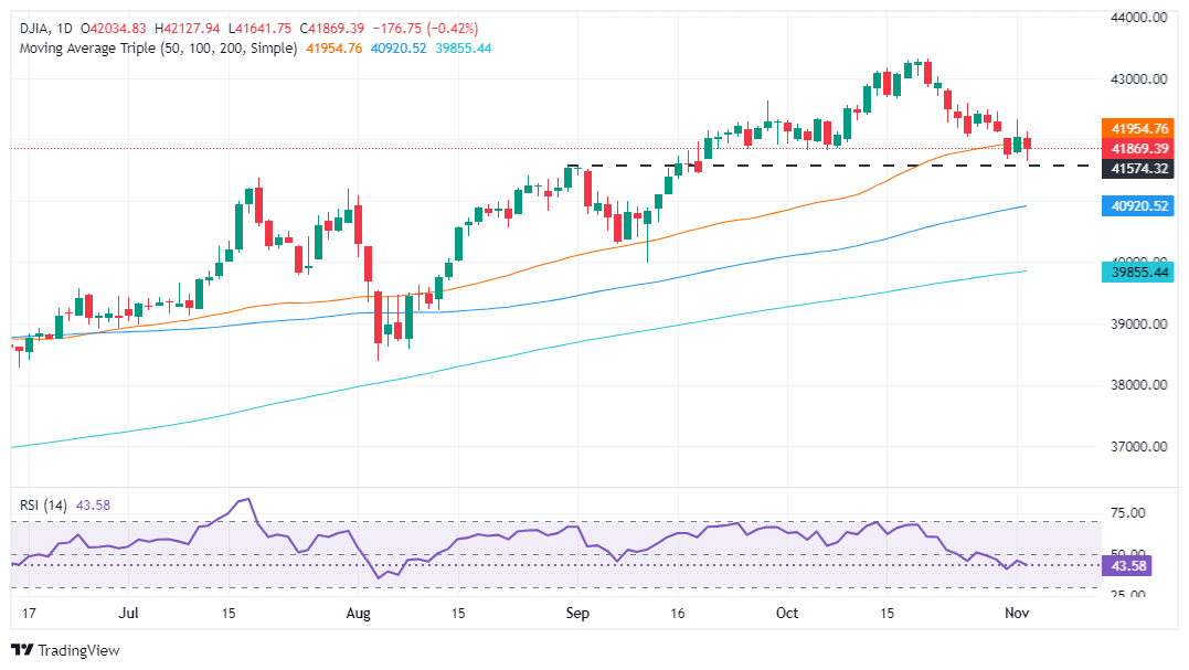 The Dow Jones Industrial Average has fallen below the 42,000 threshold after hitting a two-day peak of 42,328. On its way down, the DJIA surpassed the 50-day Simple Moving Average (SMA) at 41,953, opening the door for further downside.