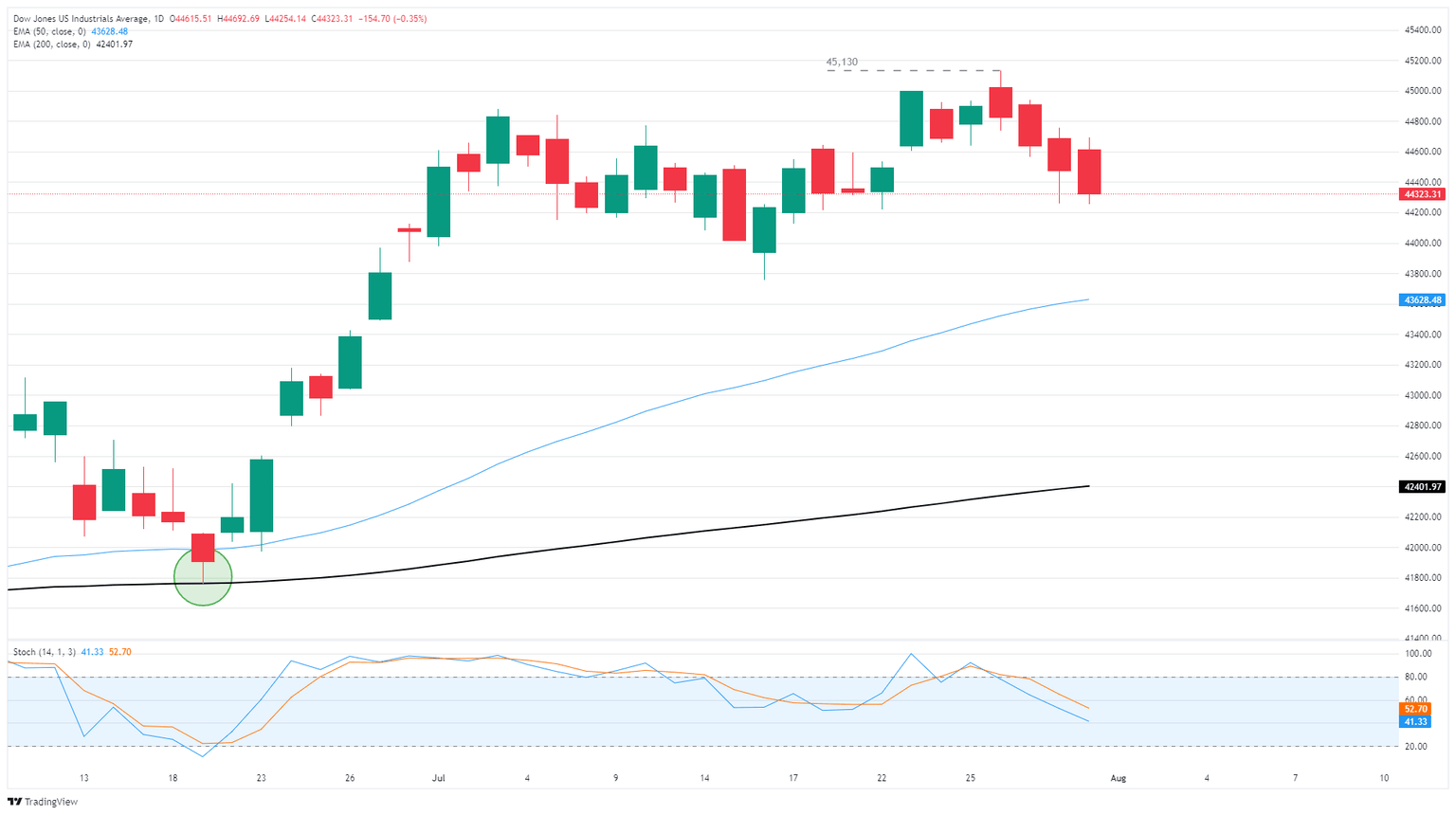 - The Dow Jones explored the bearish side on Thursday, testing below 44,500.