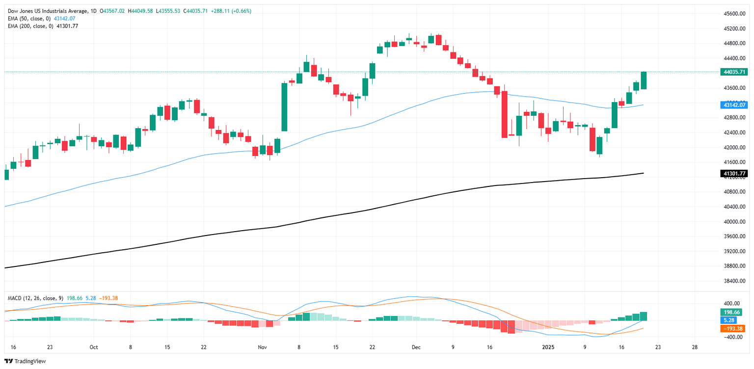 The Dow Jones Industrial Average (DJIA) absorbed newly-minted President Donald Trump’s last-minute pivot away from enacting sweeping tariffs on his first day in office with jubilation. The major equity index climbed over 500 points and is now testing the 44,000 handle for the first time since mid-December.