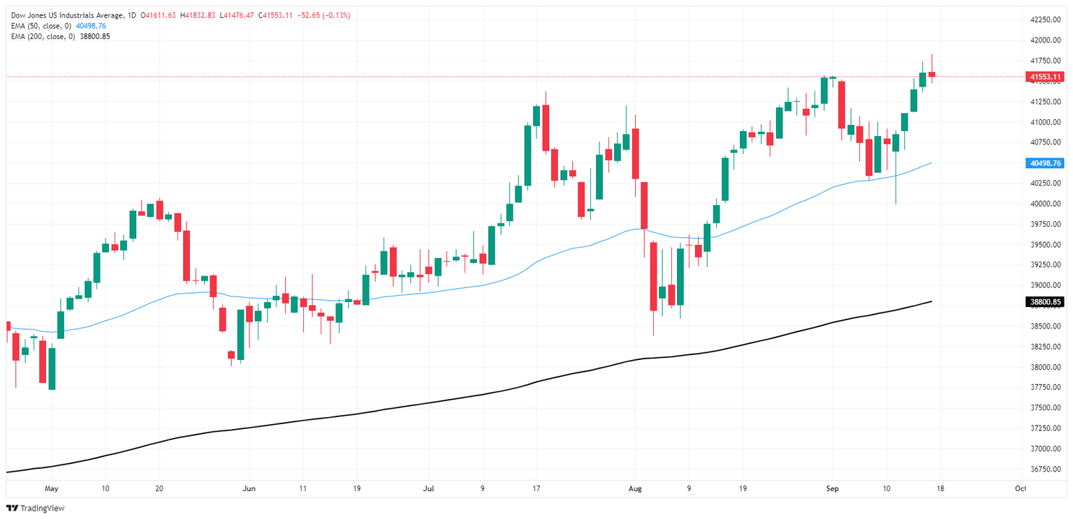 Tuesday is proving to be a truly mixed day for the Dow Jones; despite setting a fresh record high bid above 41,750, the index is also testing into the low end and set to snap a four-day win streak. Investors are holding steady as the calendar runs down to the Fed’s upcoming rate call, but nerves are still on the frayed end, but a fast tumble to the 50-day Exponential Moving Average (EMA) at 40,493 can’t be ruled out.