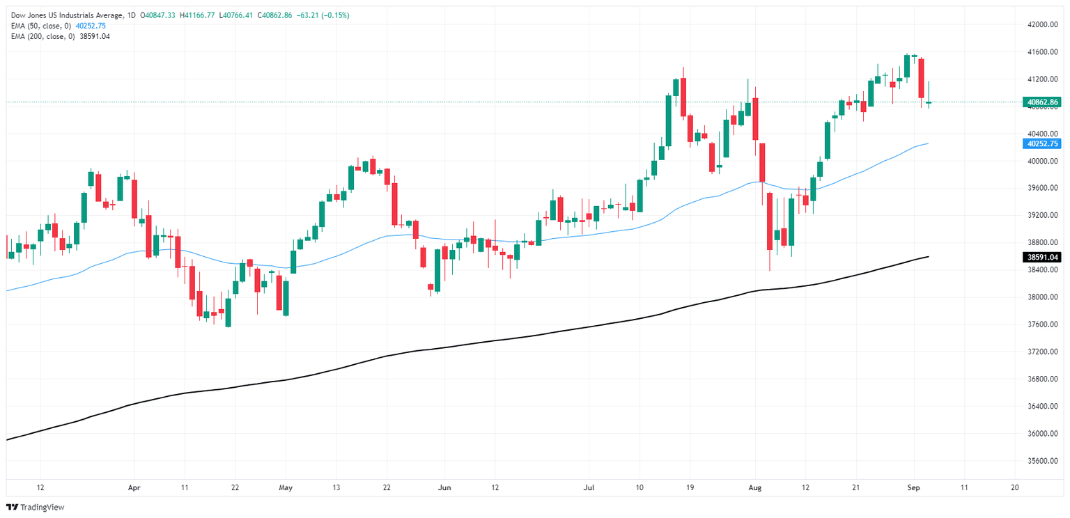 The Dow Jones couldn’t figure it out on Wednesday, rising early in the day to 41,160 before slumping back to the day’s opening prices just above 40,840. The DJIA is holding onto bullish chart paper near record highs approaching 41,600, but momentum has drained out of the bidders’ camp as price action shifts back down toward the 50-day Exponential Moving Average (EMA) at 40,253.