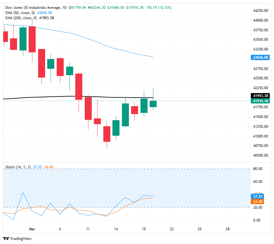 The Dow Jones continues to churn just south of key price levels, marking in several failed attempts to crack back through the 200-day Exponential Moving Average (EMA) near the 42,000 major price handle. Price action is still tilted in favor of buyers, but a lack of topside momentum is keeping bids hobbled by a new technical ceiling.