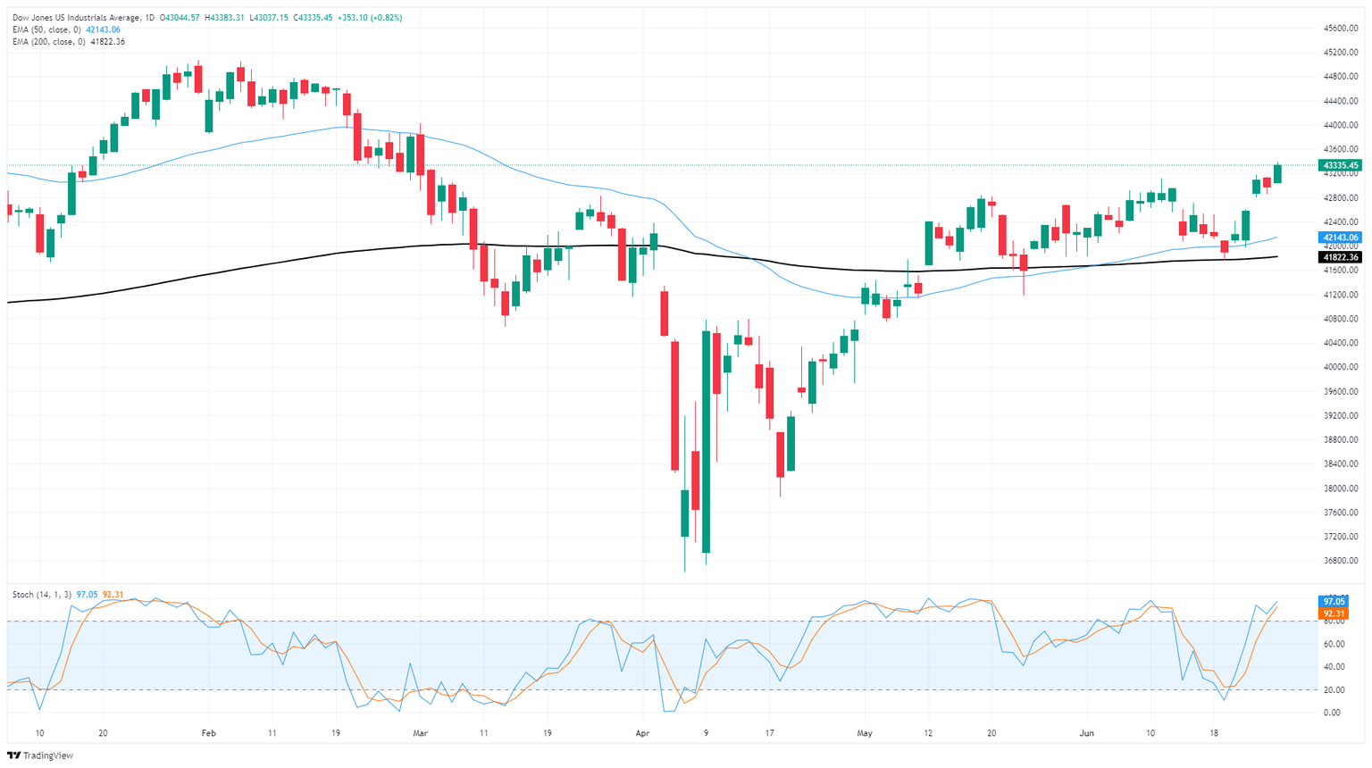 The Dow Jones Industrial Average continues its steady climb after catching a technical bounce from the 200-day Exponential Moving Average (EMA) last week, rising nearly 4% from the 41,860 region. The Dow Jones has successfully recovered all of its losses suffered following reciprocal tariff announcements in April, but it is still on the low side of record highs posted above the 45,000 handle.
