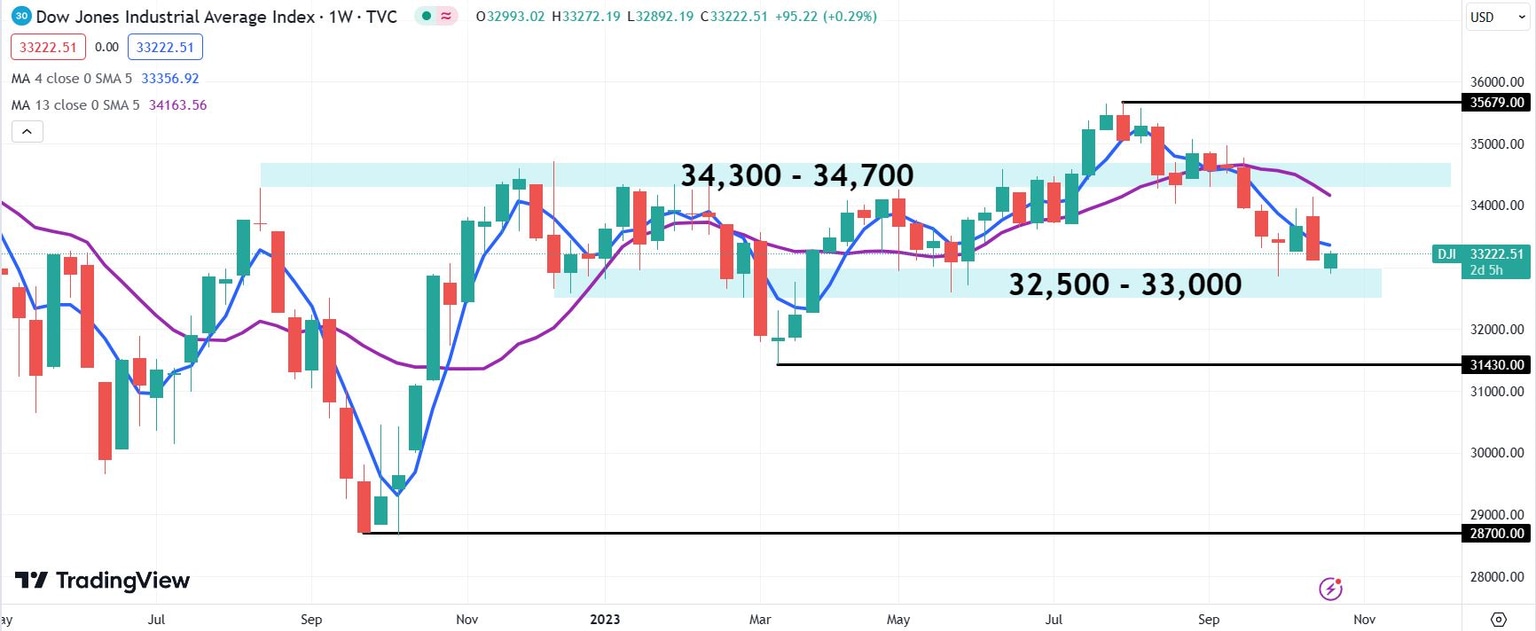 The Dow Jones Industrial Average is positioned for further losses as it has been in a swoon since July. The weekly chart below shows that the index is now trading beneath the 4-week Simple Moving Average (SMA). If there is any positive technical aspect to look at, there might be some buying now that the DJIA has reached a wide support band that spans from 32,500 to 33,000. Other than March’s plunge, the band has pushed all the pullbacks back up since December 2022, so it could again act as a true floor this time around.