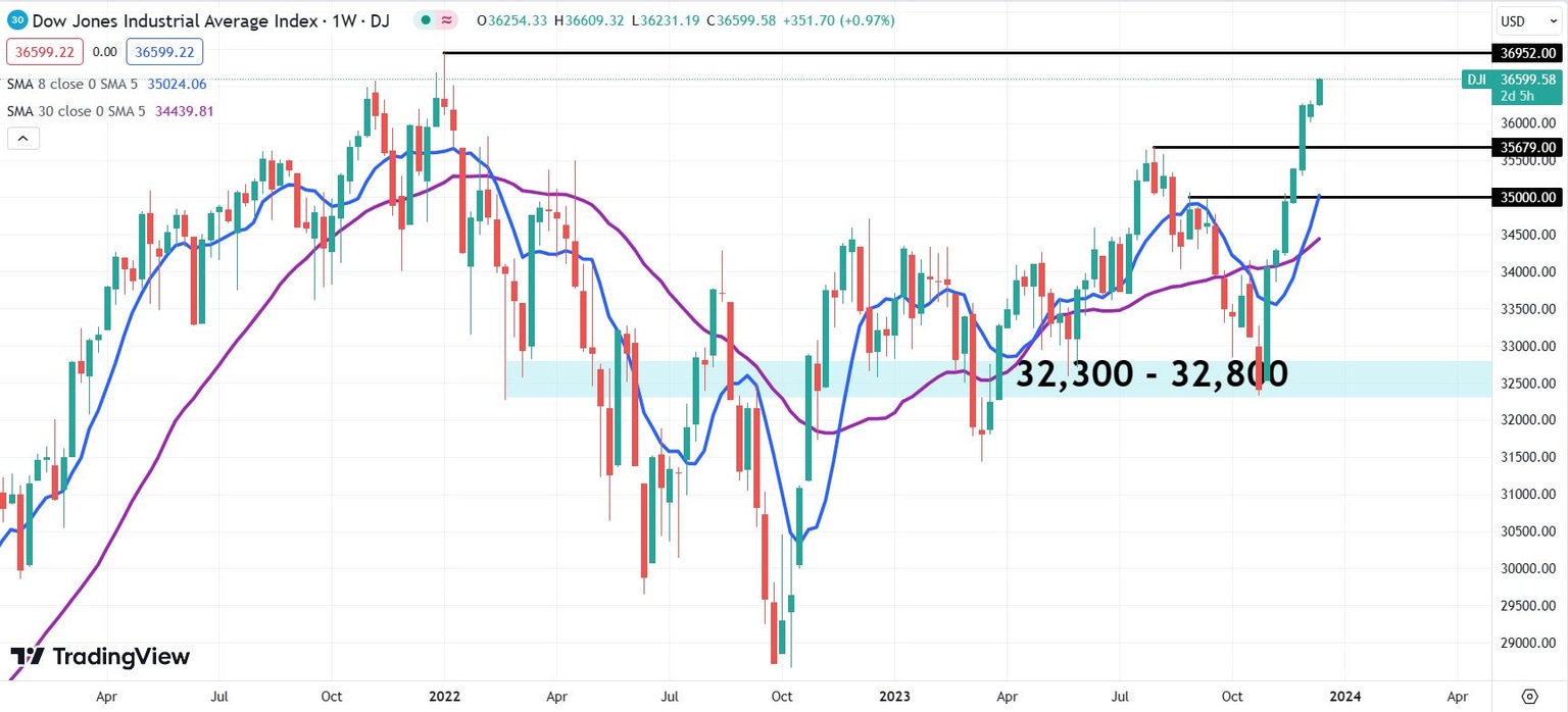 The Dow Jones index is rising for its seventh consecutive week. More importantly, the DJIA reached a new all-time high of 37,057, surpassing the previous record of 36,952 from early 2022.