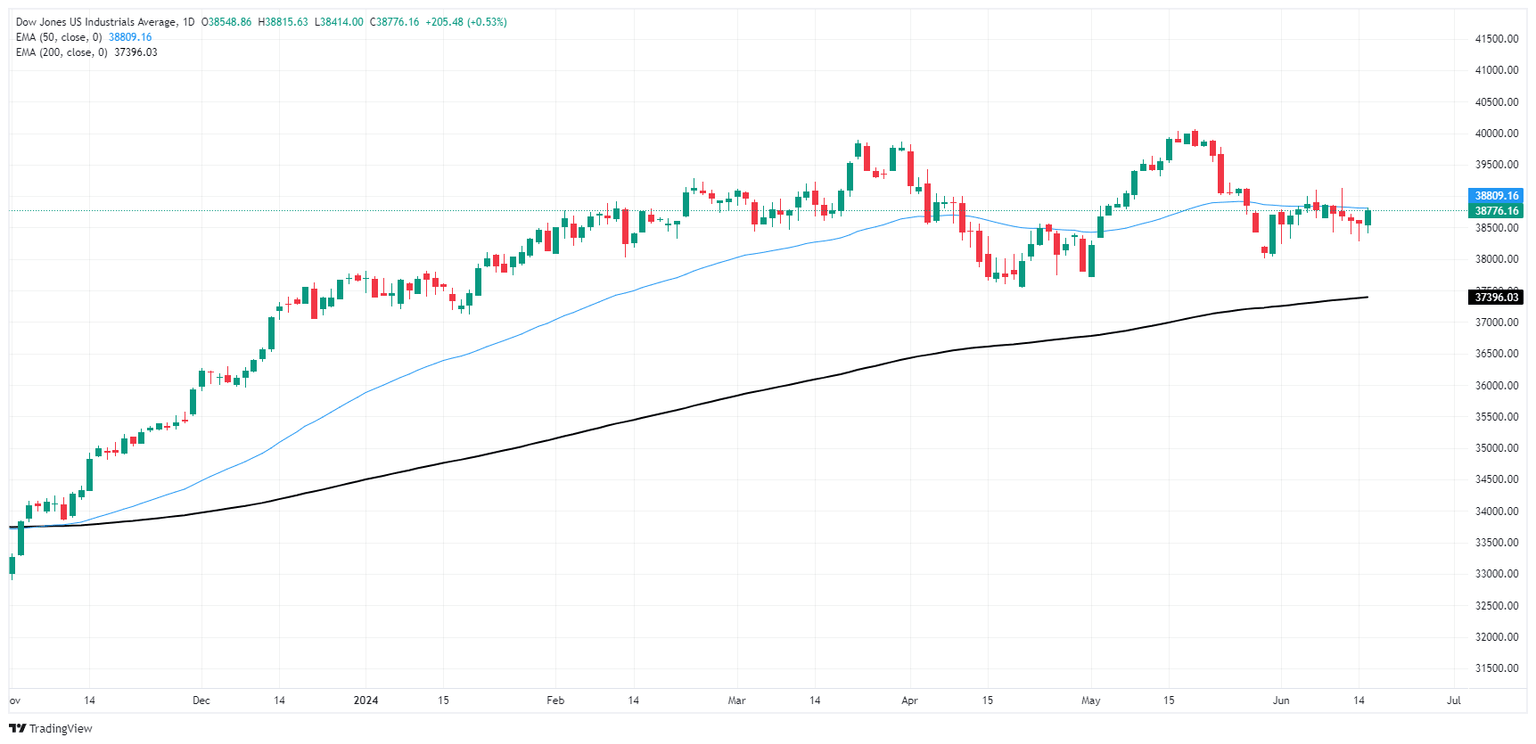The Dow Jones Industrial Average is snapping a near-term losing streak, on pace to close in the green for the first time in five trading days after closing lower for four straight sessions. The Index remains steeply off of recent all-time highs above the 40,000.00 major handle, but further declines are set to get mired in technical congestion at the 50-day Exponential Moving Average (EMA) at 38,809.34.