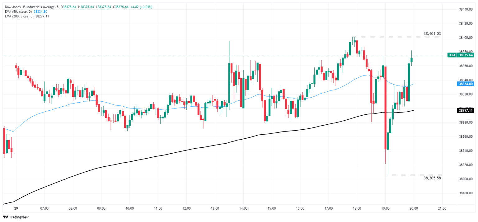 The Dow Jones remained overall tepid on Monday, climbing to a slim high of 38,401.03 before a quick whipsaw back into the 38,200.00 region with the day’s bottom bids priced in near 38,205.58. Bullish momentum remains limited but determined as the DJIA grapples with the 200-hour Exponential Moving Average (EMA) at 38,297.23.