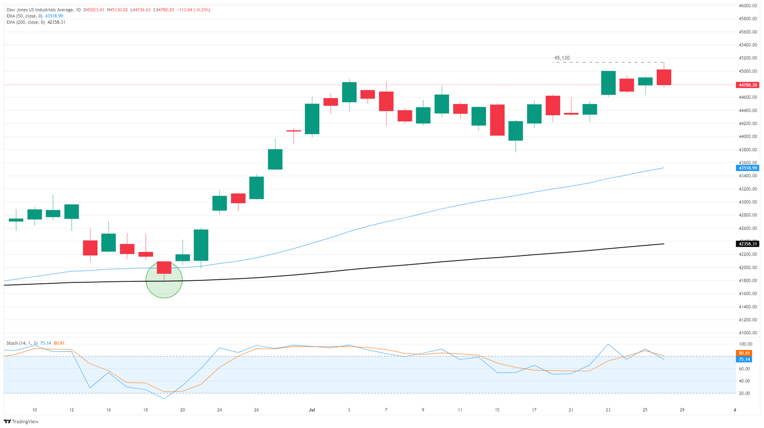 The Dow Jones clipped a record high in intraday trading on Monday, tapping 45,130 for the first time ever before slumping back into last week’s congestion. The DJIA is now battling it out near 44,750 as investors gear up for a data and earnings-heavy week. The Dow is still buried deep in bull country, up over 22% from April’s tariff-fueled bearish plunge to 36,615.