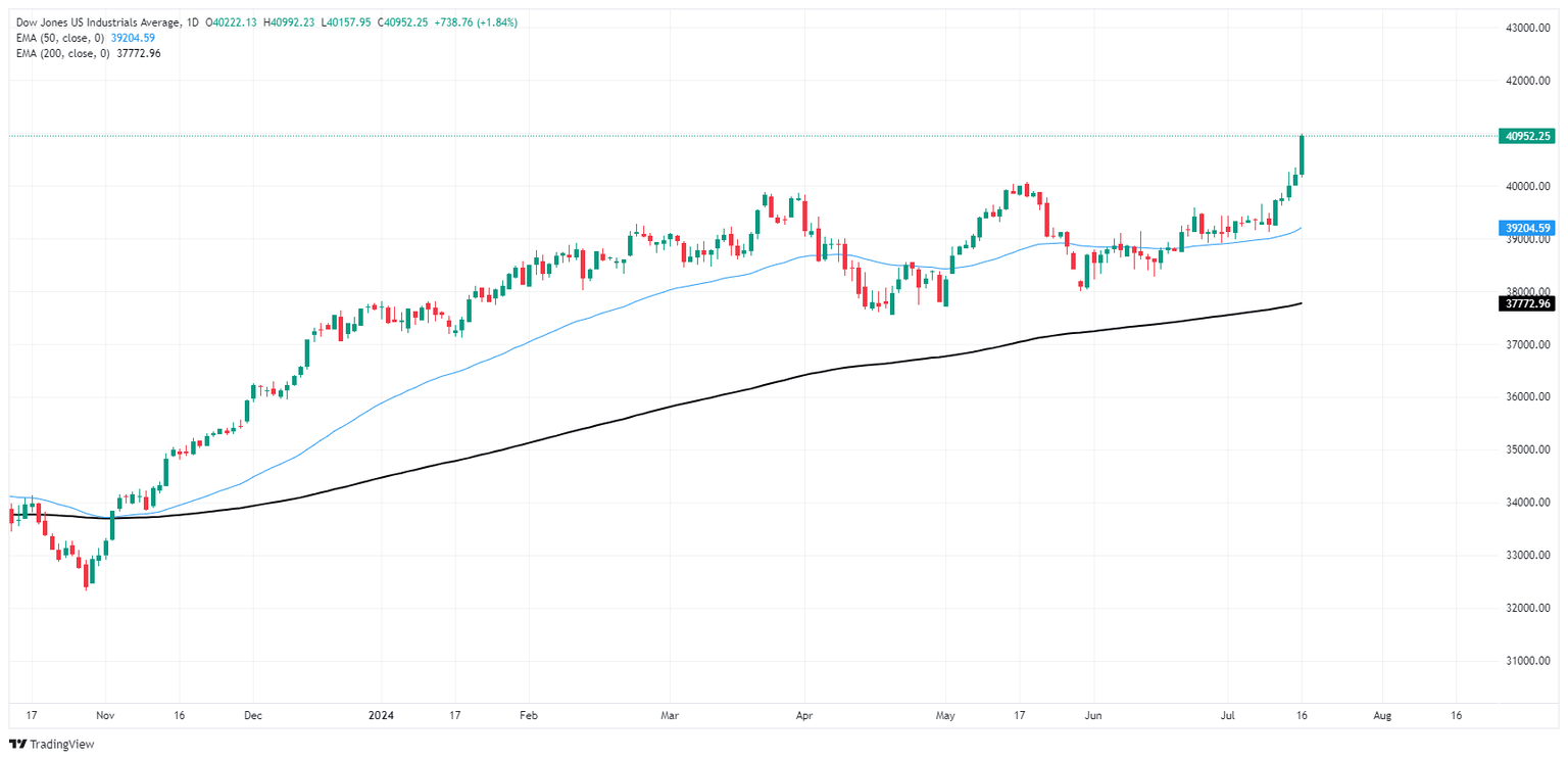 The Dow Jones soared over 740 points at its highest point on Tuesday as the major equity index makes its way toward 41,000.00 after crossing the 40,000.00 major handle for the first time back in May.