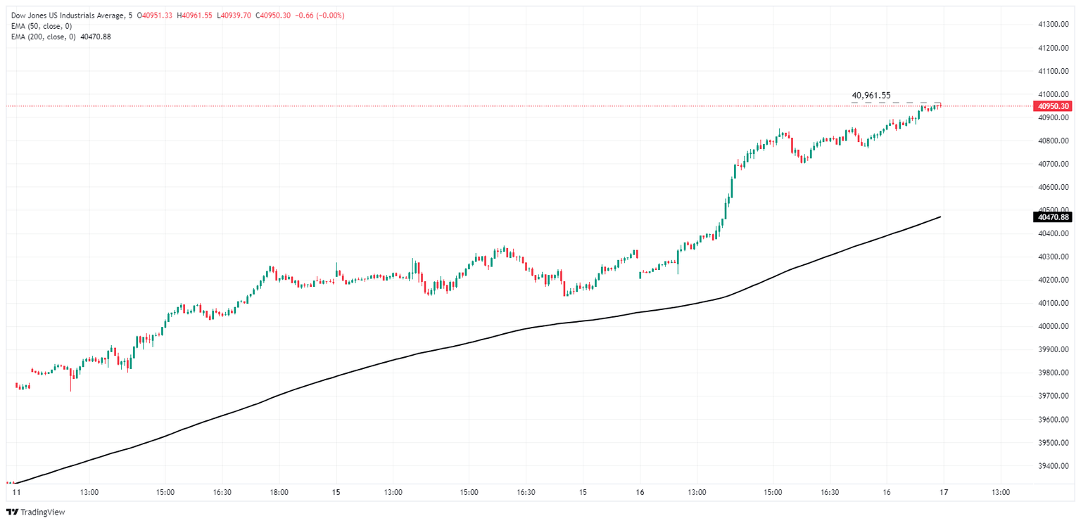 The Dow Jones has climbed over 4% and counting over the past five trading days and the index is set to challenge the 41,000.00 technical level sooner rather than later.