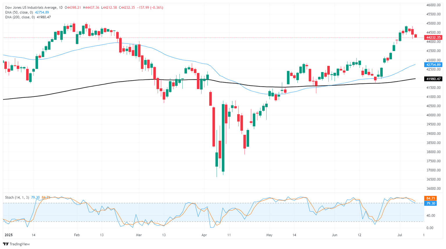 A fresh bout of technical weakness has dragged the Dow Jones Industrial Average back below 44,400 following a strong bullish performance through the last third of June. The major equity index peaked near 44,800, failing to breach all-time highs north of the 45,000 handle.