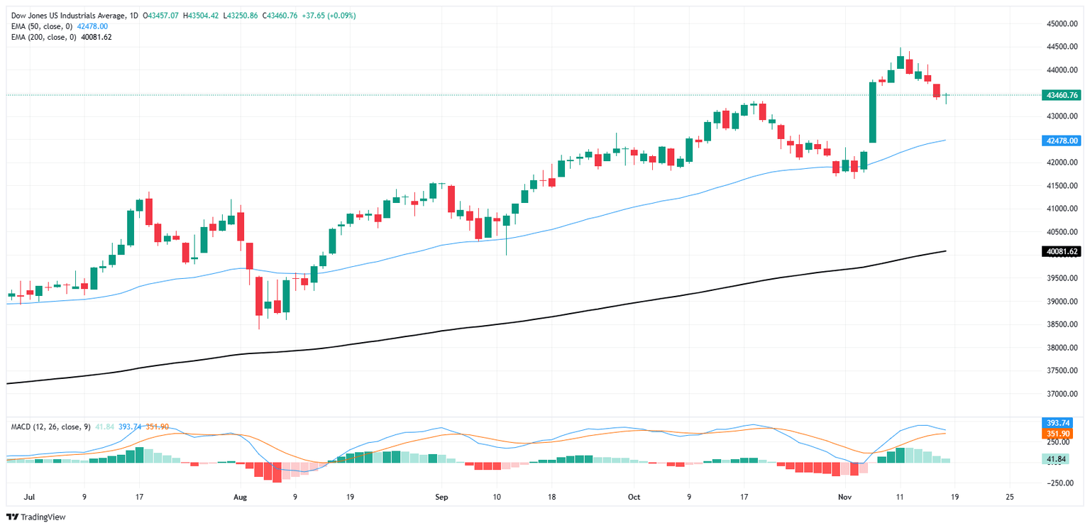 The Dow Jones Industrial Average (DJIA) held steady on Monday, testing into new weekly lows but overall keeping a tight grip on the 43,450 region. Market sentiment is grappling with a cooling effect that gripped indexes last week following the recent post-election rally.