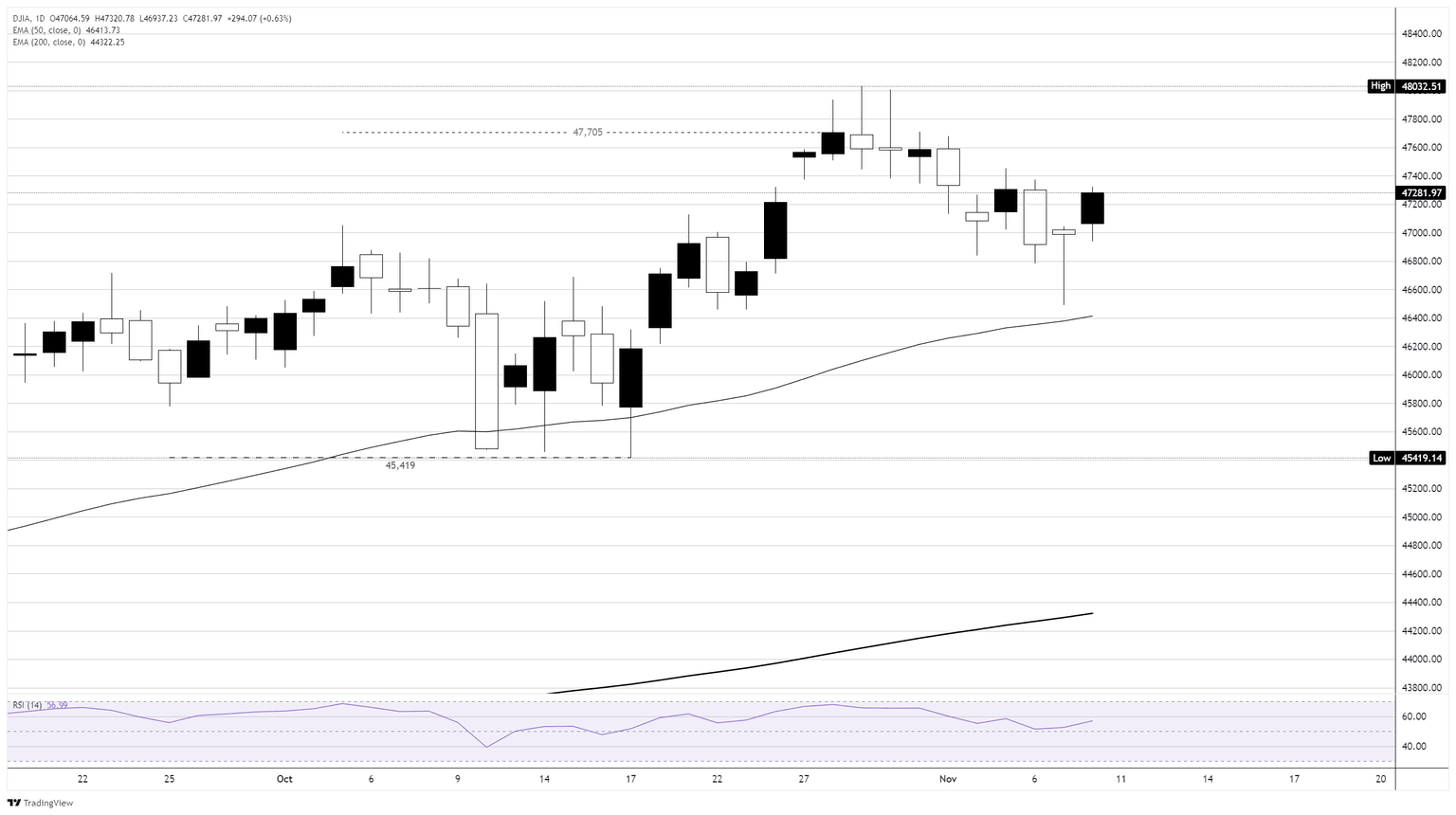 - The Dow Jones is holding steady above 47,000 as investors look for an end to the federal shutdown.