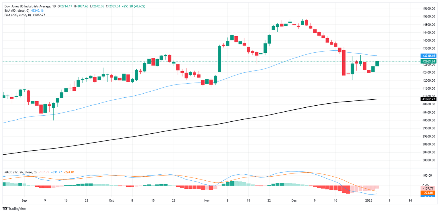 After a tepid start to the new trading year, the bulls are back on the block and the Dow Jones is getting pushed back above the 43,000 handle as bidders try to regain lost ground following the DJIA’s most recent downside plunge. The Dow Jones has rebounded 2.3% from a near-term swing low into the 42,000 region, but bidders still need to drag price action back above the 50-day Exponential Moving Average (EMA) at 43,225 before the bull market can be declared renewed.