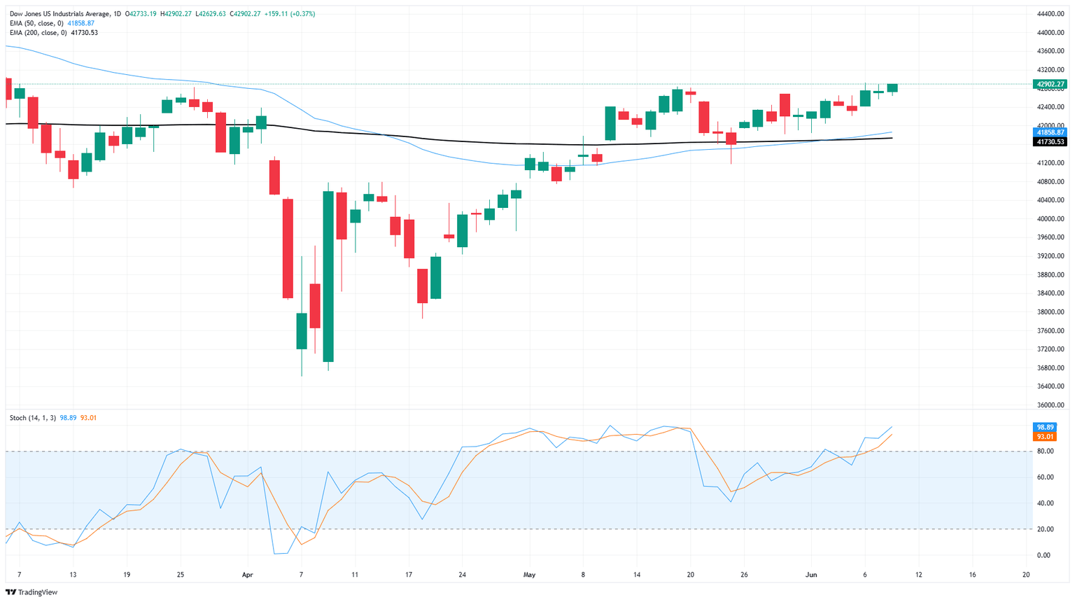 The Dow Jones Industrial Average (DJIA) is steadily approaching the upper limit of its recent consolidation, getting closer to a near-term technical ceiling at the significant level of 43,000. Currently, price movements are strong, remaining above the 200-day Exponential Moving Average (EMA) around 41,650. Bullish momentum might experience a temporary pause as technical oscillators indicate overbought conditions.
