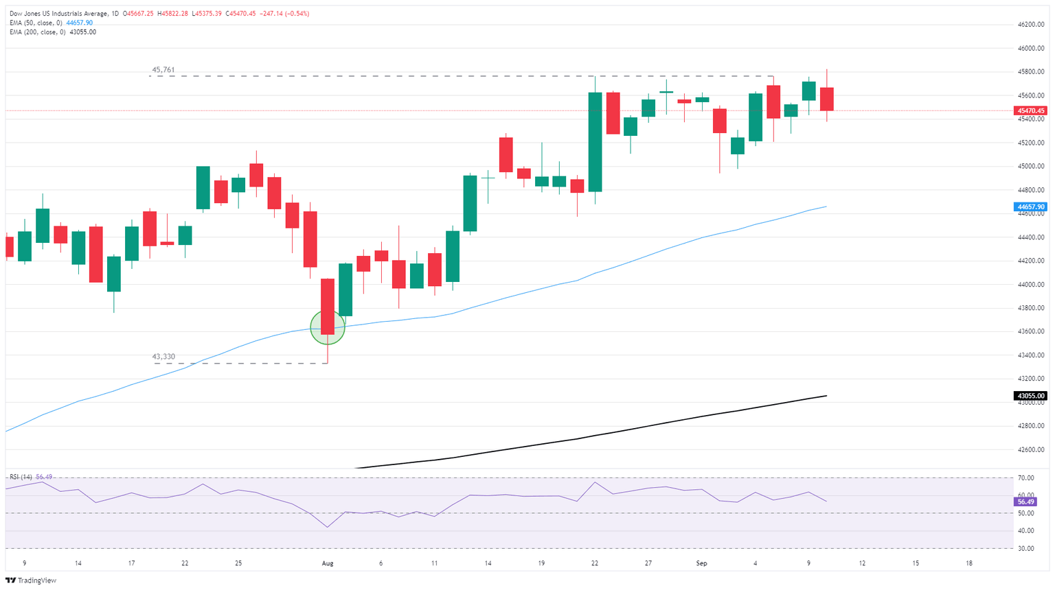 The Dow Jones briefly tested record highs above 45,800 on Wednesday, but the major equity index pivoted into the bearish side, shedding nearly 450 points peak-to-trough before finding a tentative foothold near 45,500. The Dow is still holding close to all-time highs, but bullish momentum is struggling to find the gas pedal. The 50-day Exponential Moving Average (EMA) is rising quickly into the 44,700 region and could pose a fresh technical challenge (or target) for short pressure.