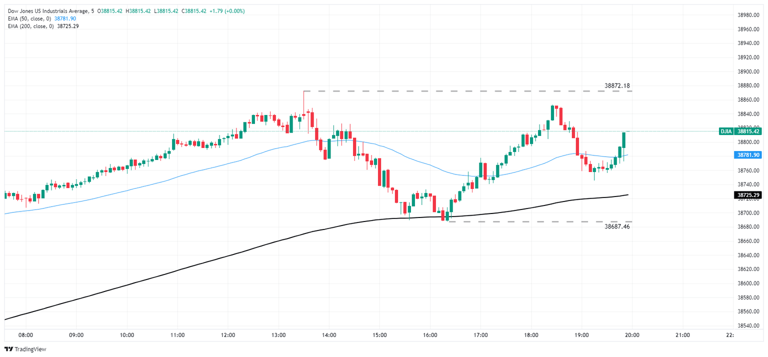 The Dow Jones climbed in early Monday trading to test a fresh daily high at 38,872.18 before a midday pullback to 38,687.46. The DJIA continues to aim for chart paper above 38,800.00 as equities look for firmer gains.
