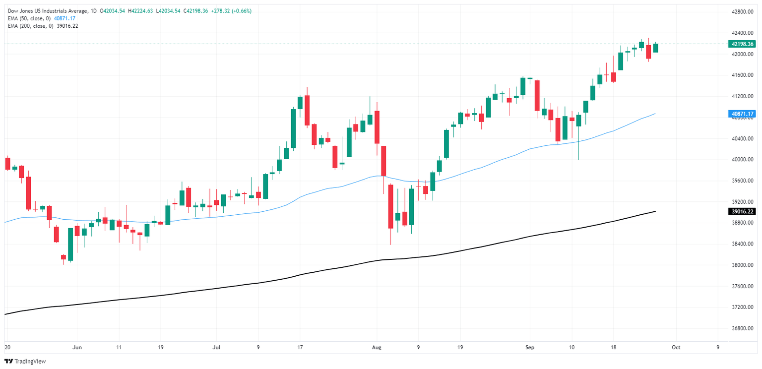 Dow Jones buyers have stubbornly staked their claim on the 42,000 handle, shrugging off signs of overbought conditions. On the low side, sellers will be looking to drag the equity board back down toward the 50-day Exponential Moving Average (EMA) near 40,870.