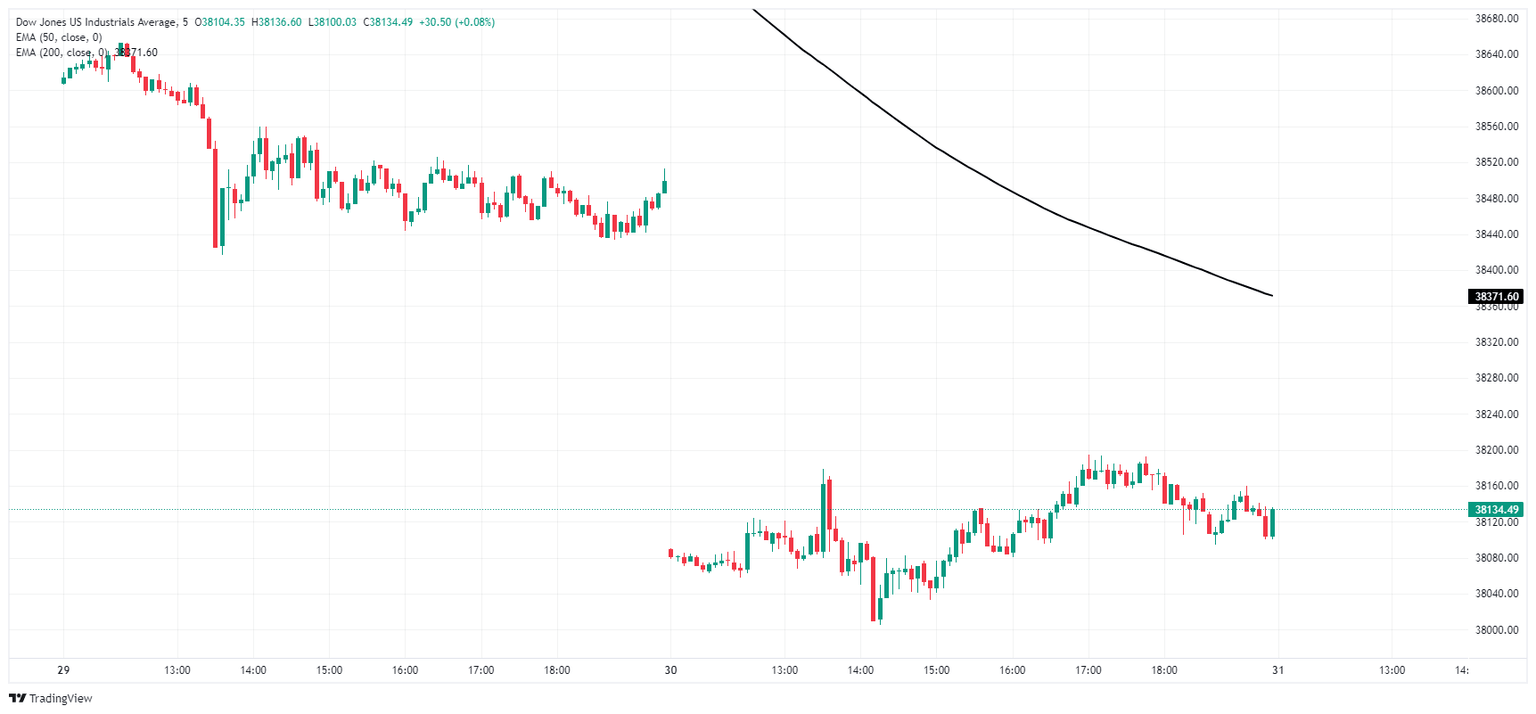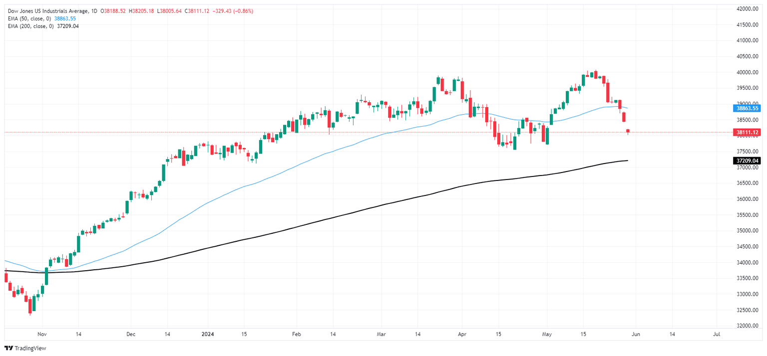The Dow Jones is down sharply from record highs set just above 40,000.00 nearly two weeks ago, falling over 5% peak-to-trough. The DJIA is grinding back towards the 200-day Exponential Moving Average (EMA) at 37,233.38, a key technical barrier the Dow Jones hasn’t hit since November of 2023.