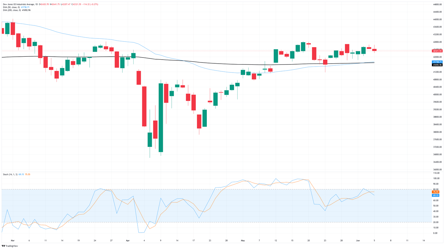 The Dow Jones is pinned to the 42,500 region, with bullish price action firmly capped below the 43,000 handle. However, downside pressure remains firmly subdued, with bids strung along the north side of the 200-day Exponential Moving Average (EMA) near 41,600.