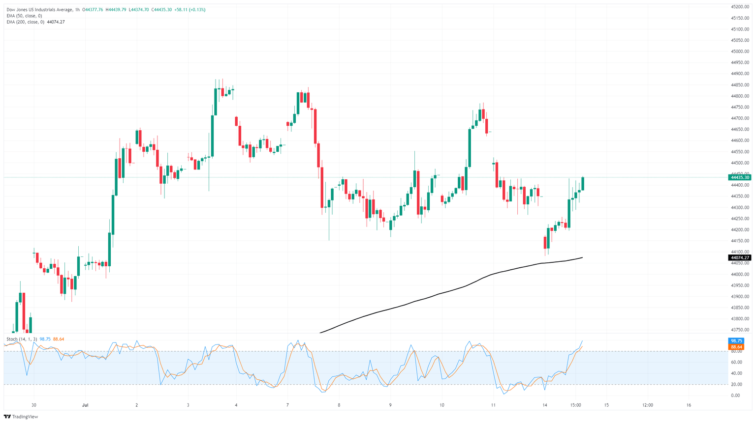 - The Dow Jones is holding near 44,400, albeit with a jittery note.