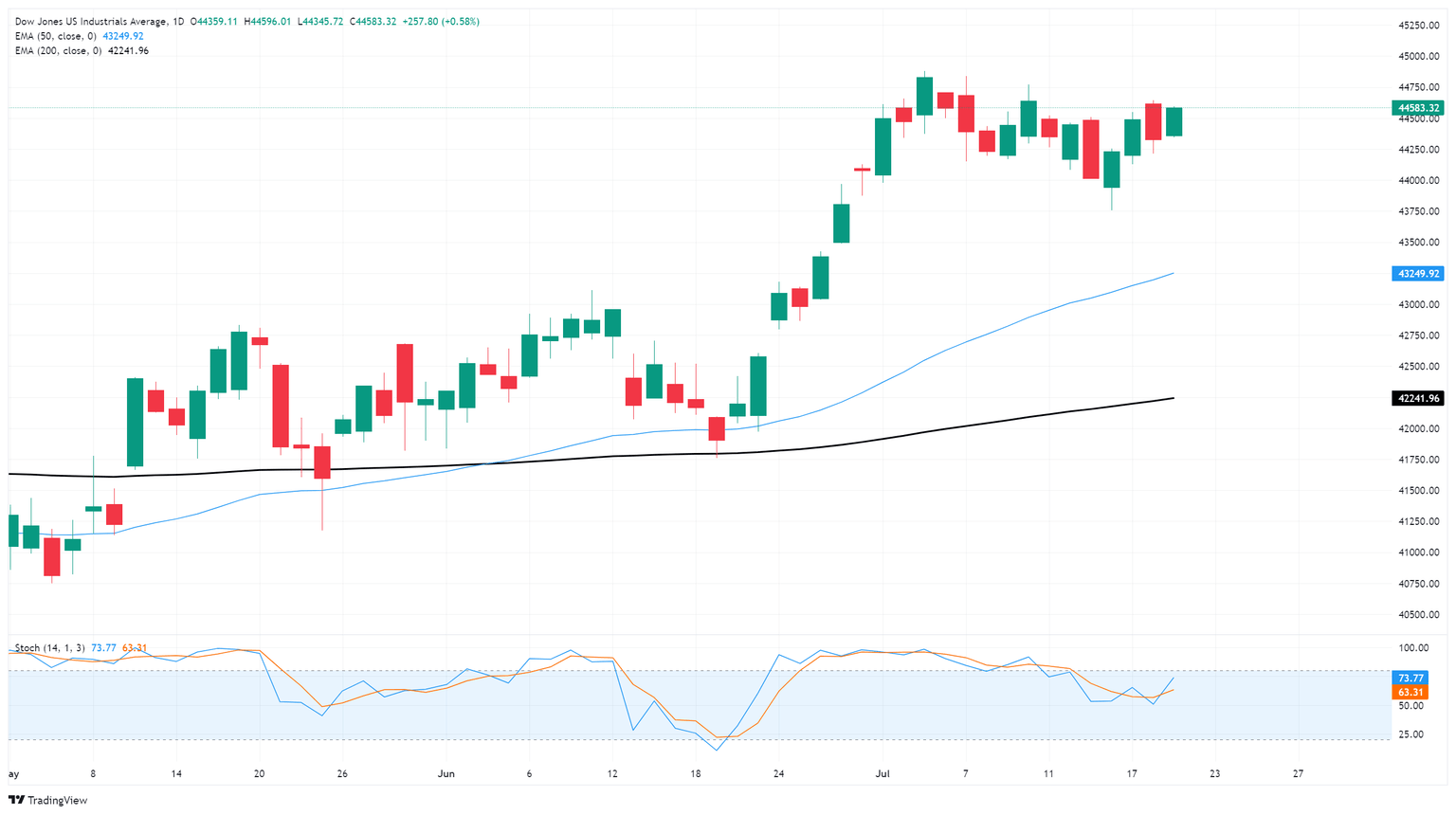 The Dow Jones’ latest price pullback appears to have fizzled as bearish momentum struggles to find a foothold. The Dow is still struggling to find fresh ground above the 45,000 major handle, but price action is equally unwilling to explore chart territory below 44,000 for the time being. Immediate technical support is baked in at the 50-day Exponential Moving Average (EMA) near 43,250, with the 200-day EMA parked far below, just north of 42,000.