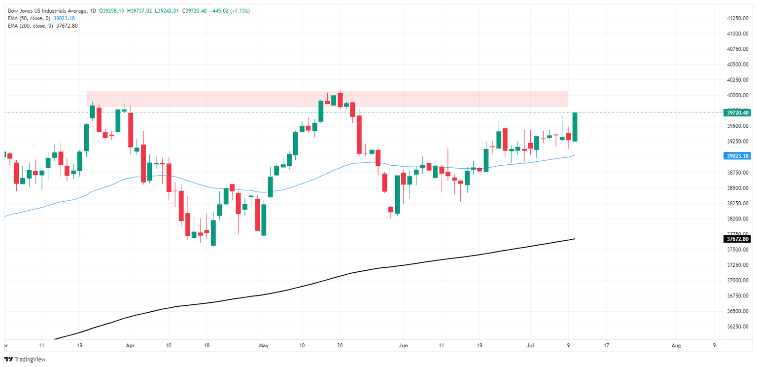 The Dow Jones has given a choppy two-day performance, climbing a full percentage point bottom-to-top from Tuesday’s lows near 39,130.00. Bullish momentum is poised for a breakout of recent consolidation as price action gets squeezed between the 50-day Exponential Moving Average (EMA) near 39,000.00 and a supply zone priced in near the 40,000.00 major price handle.