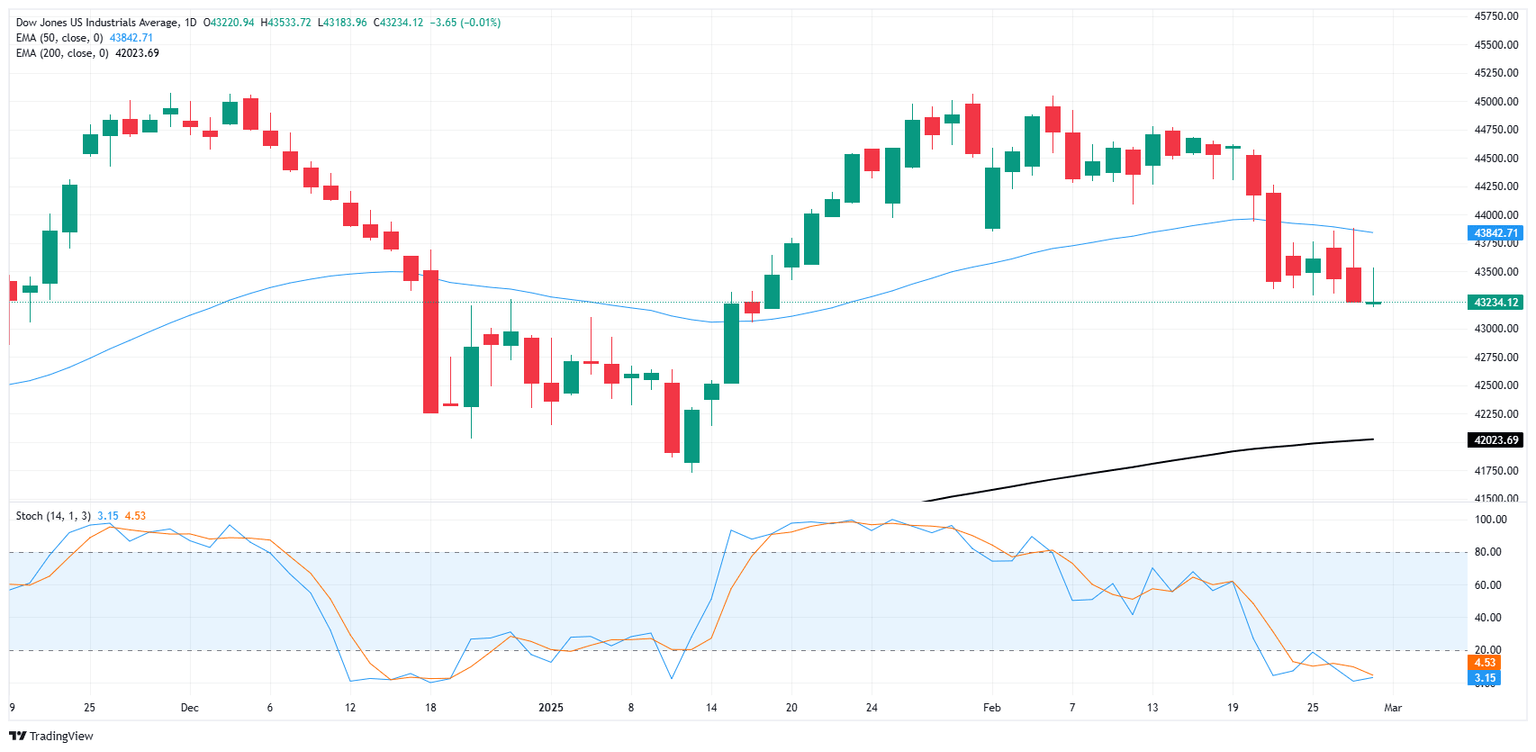 The Dow Jones continues to churn lower into bear country, trading on the south side of the 50-day Exponential Moving Average (EMA) near 43,840. The major equity index is still holding above the 200-day EMA at the 42,000 handle, but that particular bull run is growing long in the tooth with the Dow entirely outrunning its own 200-day EMA for over two years. Bullish momentum has certainly faded, but time is running out for sellers as technical oscillators grind into oversold territory, and the DJIA is barely down 4% from its last swing high near 45,000.