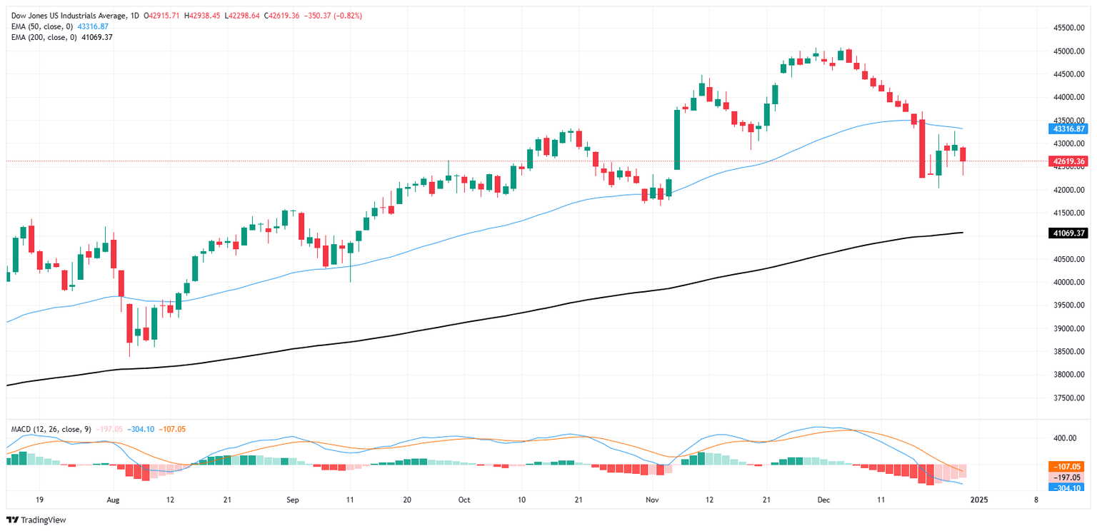 The Dow Jones Industrial Average (DJIA) shed over 300 points on Monday, plunging to a near-term low just south of 42,300 before a half-hearted recovery back to 42,500 as equities swoon in one of the last trading days of the year. The broad-market tech rally, buoyed into lofty heights by even loftier investor expectations for the AI-fueled future, looks set to drain out of the markets for the time being.