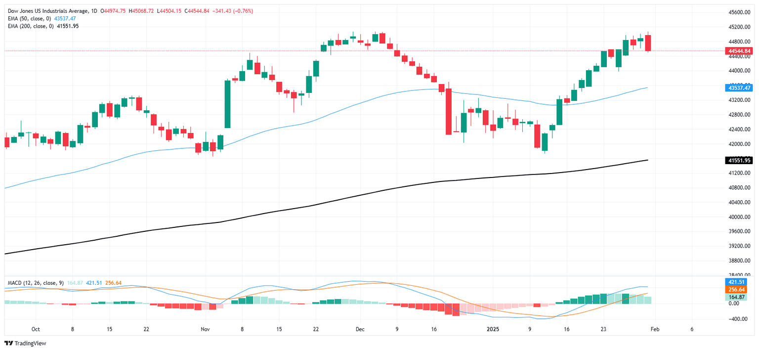 The Dow Jones’ bearish price action on Friday sent bids back below 44,800, crimping chances for a bullish recapture of record highs above 45,000. The major equity index is now testing back into the 44,600 region, and the DJIA’s recent bull run appears to be evaporating.