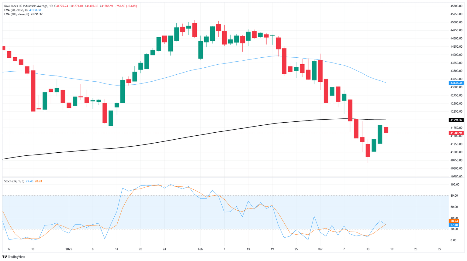 Both the Dow Jones and the Standard and Poor’s 500 (S&P) are back into the red on Tuesday. The Dow eased back below the 42,000 level, and the S&P 500 continues to toy with the 5,600 handle. Both major equity indexes are testing correction territory, down around 8% from record highs.