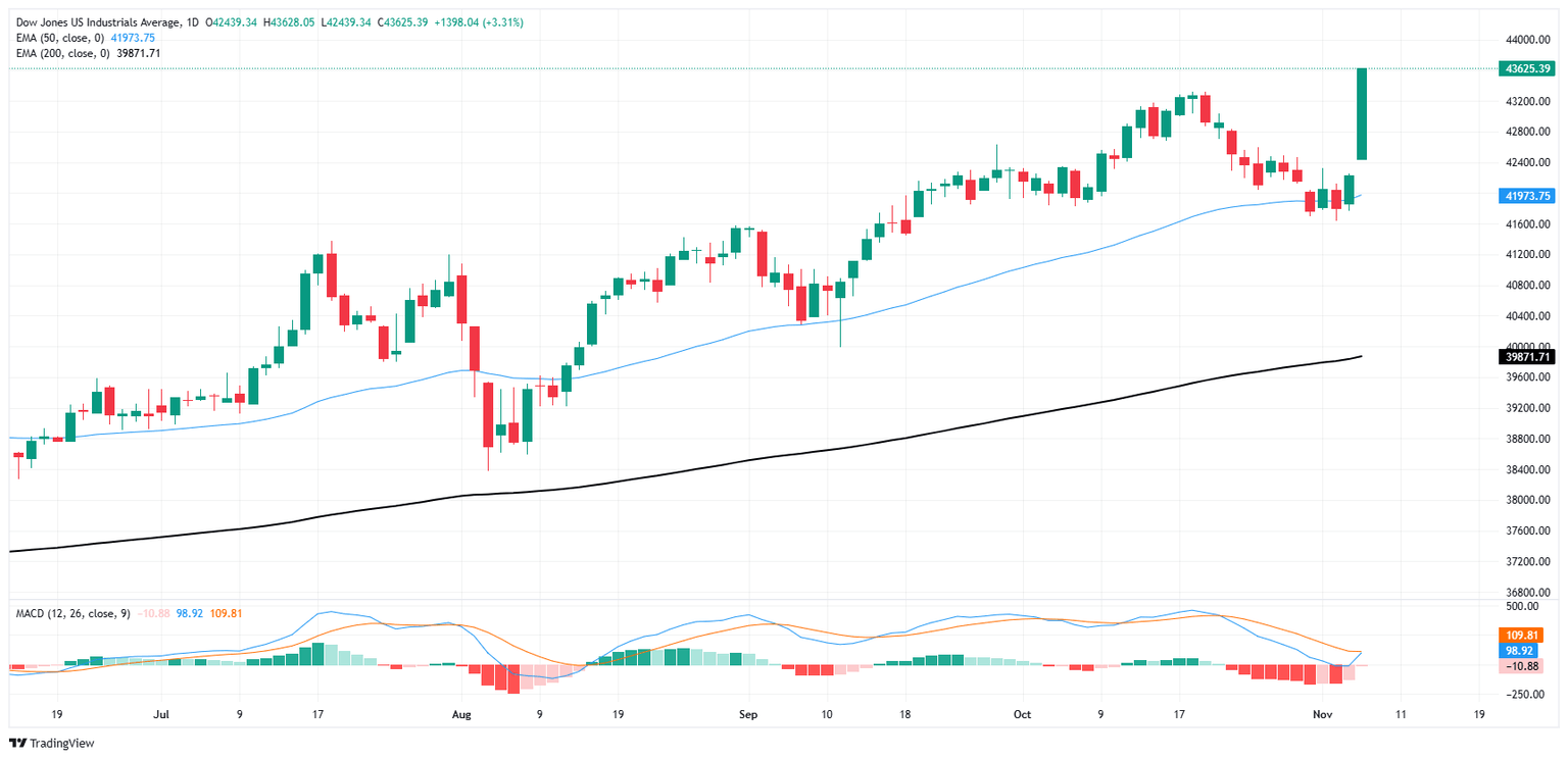 The Dow Jones Industrial Average (DJIA) surged to a fresh record on Wednesday, climbing into 43,700 after US presidential candidate looks set to sweep a victory away from Democratic nominee and current Vice President Kamala Harris. Equities are surging on expectations of stock-friendly moves from future President Donald Trump, specifically hopes for further deregulation in the banking sector.