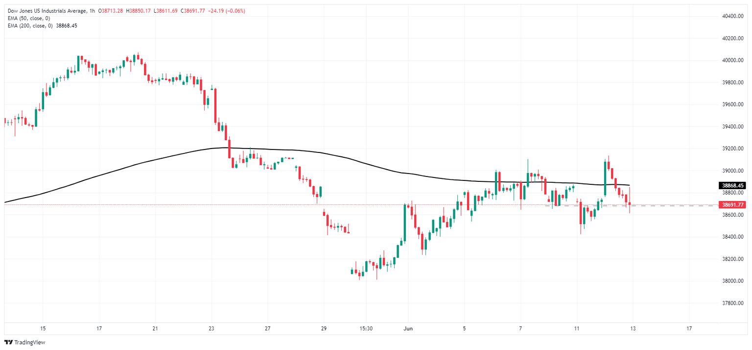 Wednesday’s CPI-fueled rally briefly peaked above 39,120.00 before risk appetite chilled and sent the Dow Jones back into the day’s opening range near 38,790.00. The major equity index remains mired in near-term congestion at the 200-hour Exponential Moving Average (EMA) at 38,866.60. Bidders have managed to price in a technical rebound from the week’s low bids near 38,400.00, but technical resistance is building from multiple rejections from chart regions north of the 39,000.00 handle.