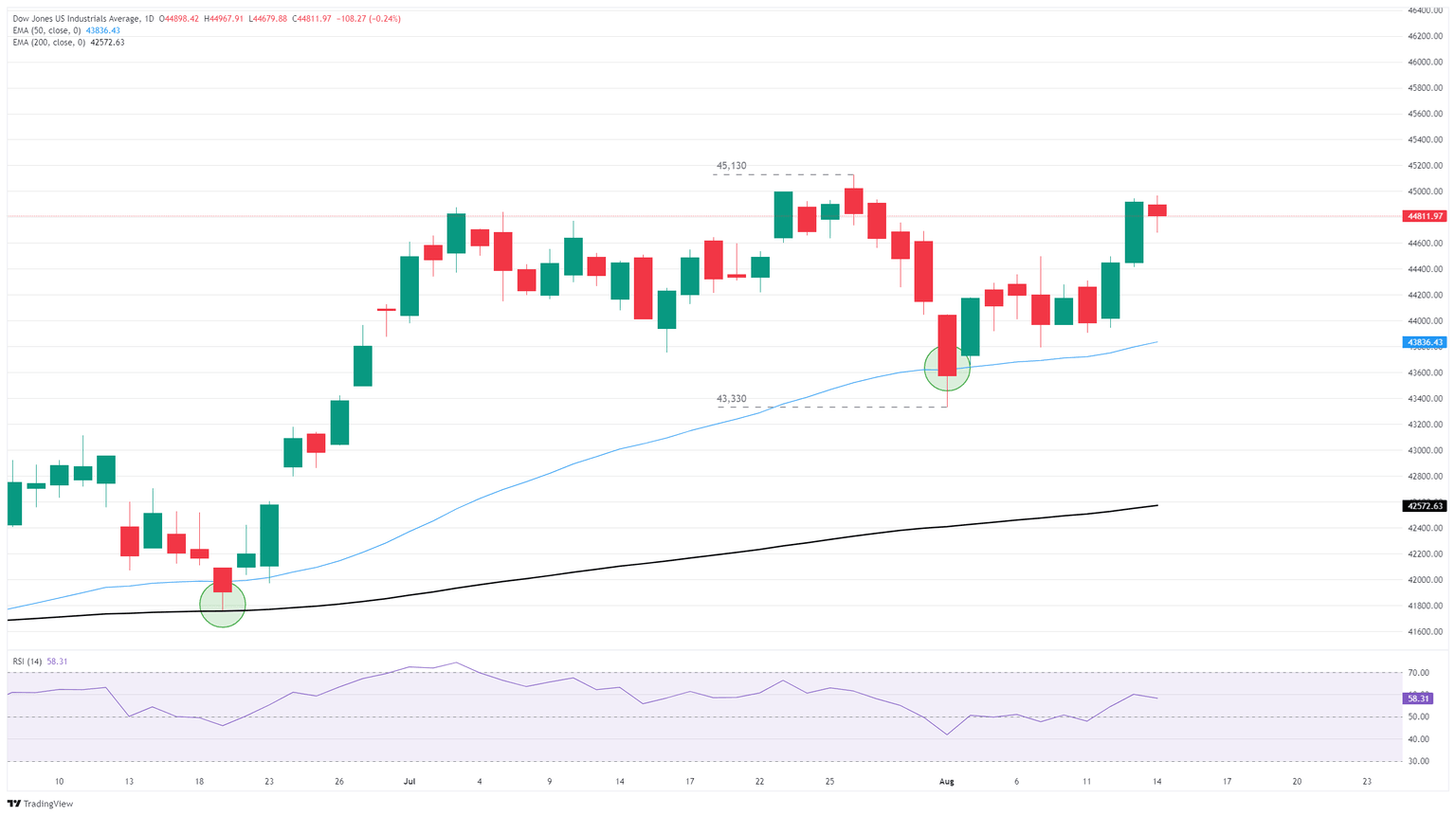 The Dow Jones has fumbled a bullish push to regain the 45,000 major handle, but the major equity index is still trading well into bull country, a full two percent above the 50-day Exponential Moving Average (EMA) near 43,830. Despite fresh weakness on disappointing macro data, the Dow has still managed to claw out nearly 3.8% bottom-to-top from its last swing low.