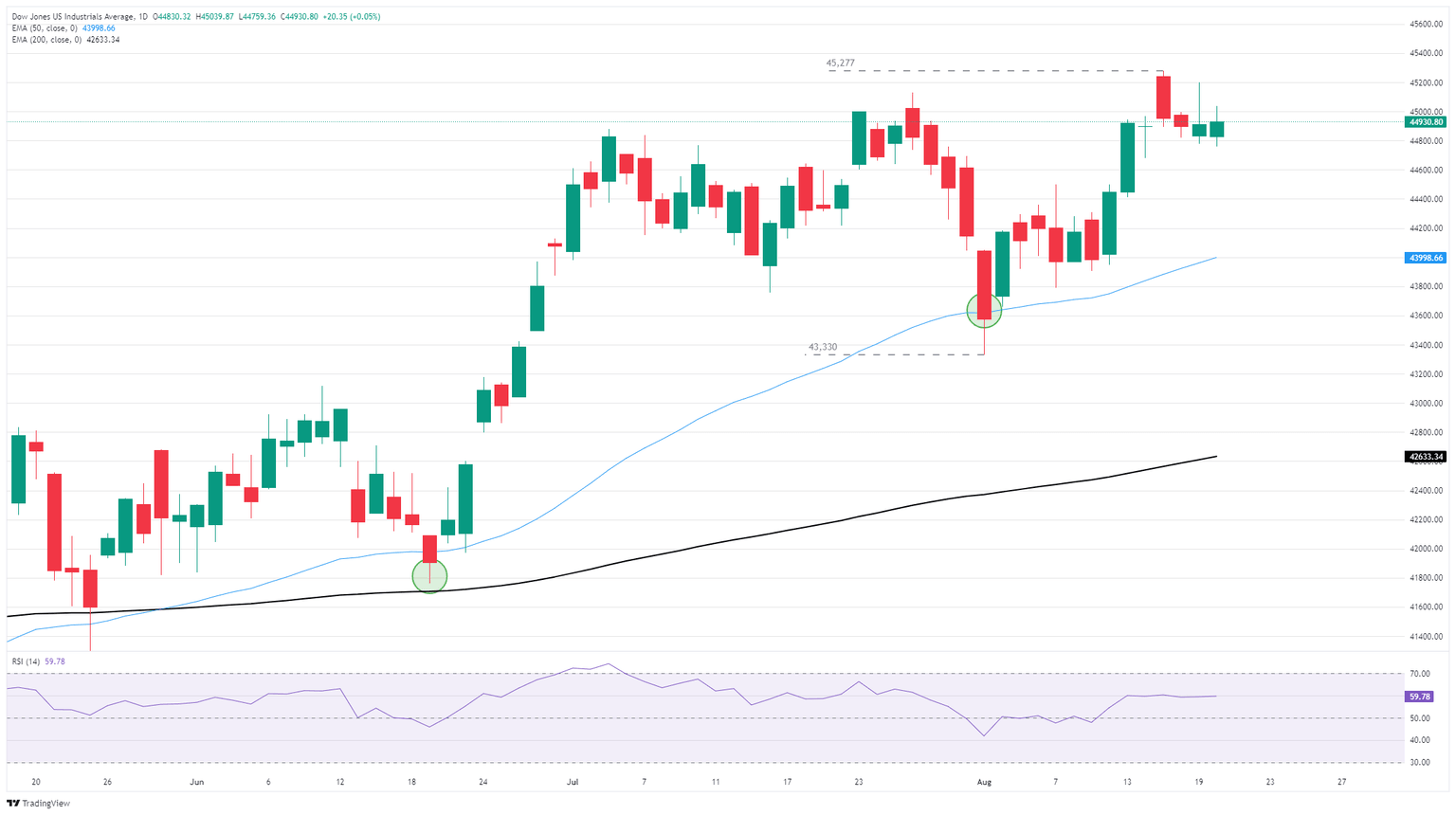 The Dow Jones is still struggling to pick a direction, tussling with the 45,000 price handle through most of this week. On an intraday level, the Dow is continuing to test record highs north of 45,200, but definitive closes above those levels remain elusive. Despite near-term downside pressure, the Dow Jones is holding firmly on the high side, and continuing technical pressure into all-time peaks above last week’s 45,277 should be expected.
