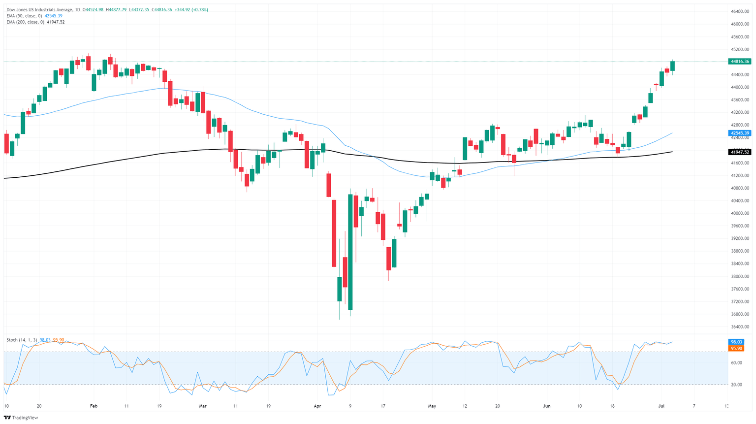 June just started, and the Dow Jones Industrial Average is already on pace to chalk in a third straight month of gains. The Dow Jones is up over 22% from its post-tariff announcement lows near 36,600, testing the 44,800 region and on pace to rechallenge all-time highs just above 45,000.