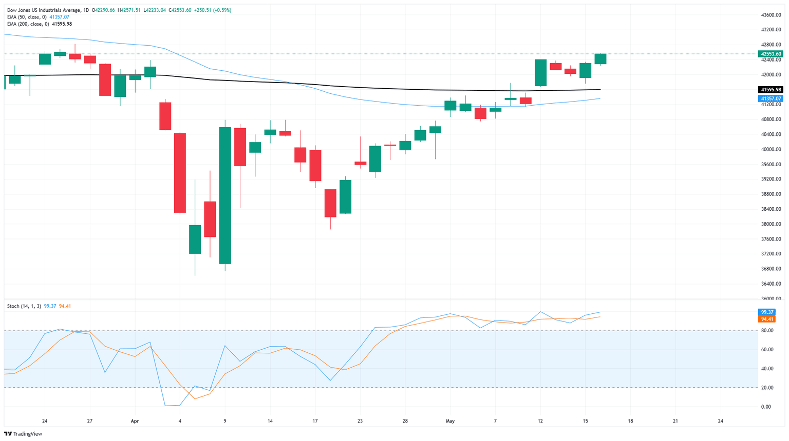 The Dow Jones Industrial Average has finally clawed its way back the 42,500 level for the first time since March. Trade headlines sent US equity markets into a freefall in the first quarter, sending the Dow Jones into the 36,600 region. After weeks of paring back losses, the DJIA is finally back into positive territory for 2025.