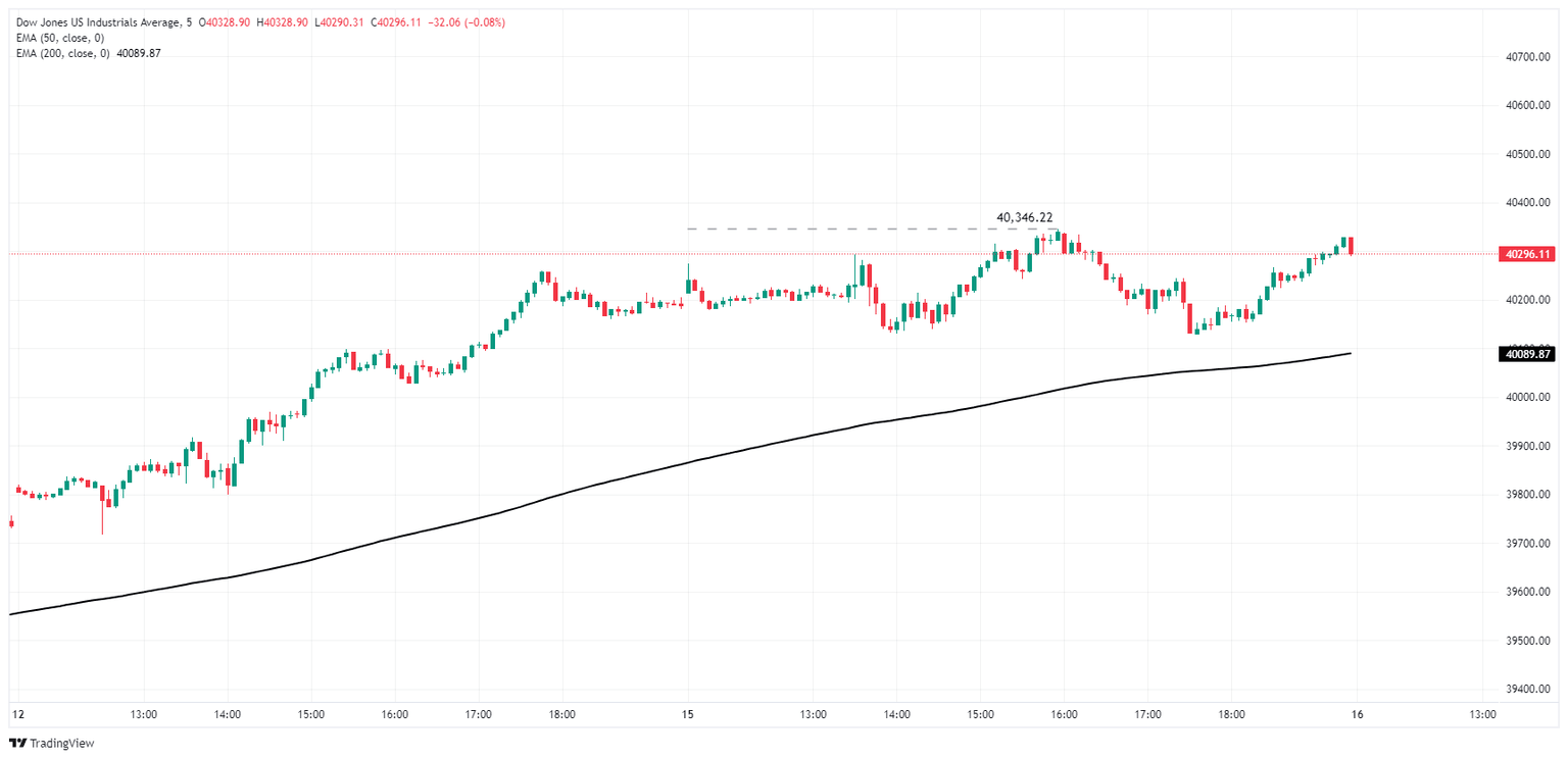 The Dow Jones is holding close to the 40,200.00 handle on Monday after setting a fresh record high, and bidders are trying to keep price action propped up above the 40,000.00 major handle. Daily candlesticks continue to hold on the high side of the 200-day Exponential Moving Average (EMA) rising towards 38,000.00.