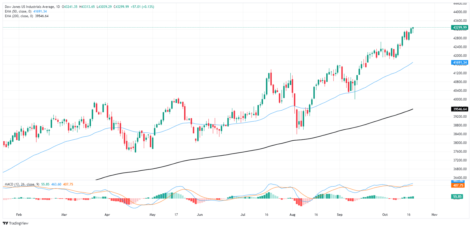 Intraday bids on the Dow Jones crossed 43,300 for the first time ever on Friday, setting a record high for the fourth time this week. The major equity index has climbed over 16.6% bottom-to-top from 2024’s early lows near 37,140, and price action has fully outpaced the 200-day Exponential Moving Average (EMA) since November of 2023.