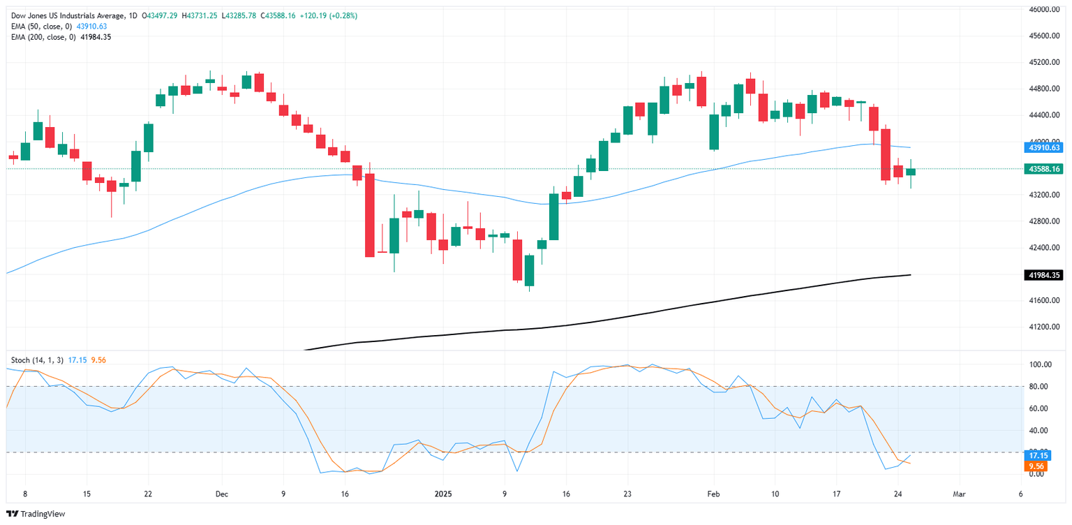 - The Dow Jones tested fresh lows on Tuesday but remained stuck near 43,500.