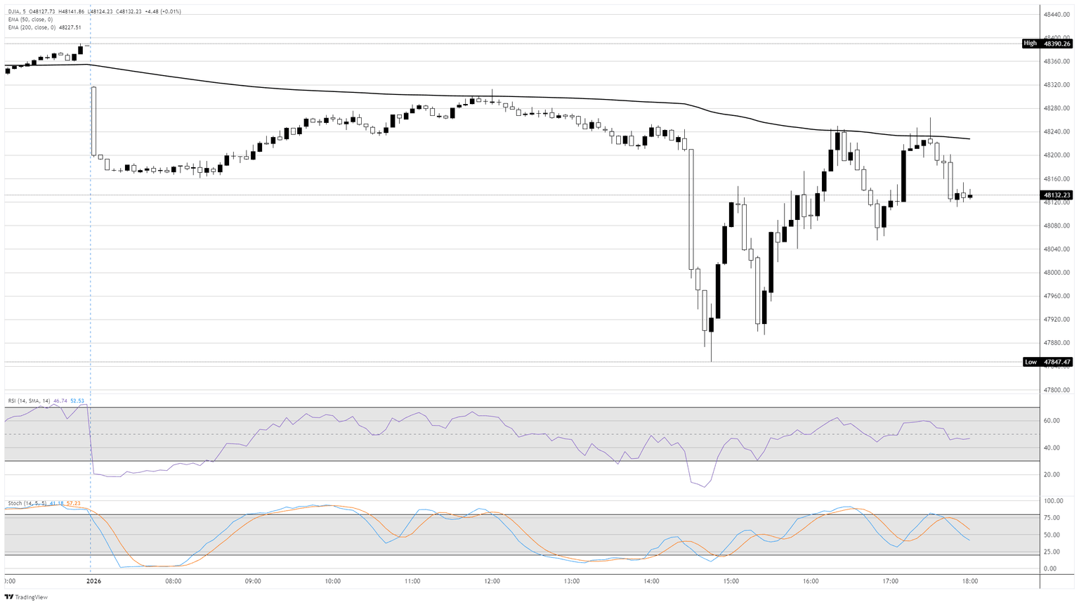 US equities opened 2026 on a cautious note, with the S&P 500 and Nasdaq essentially flat as strength in semiconductors offset weakness elsewhere in technology. The Dow Jones found some footing on Friday after an early plunge through the overnight session, holding steady near where the first trading day of 2026 started.