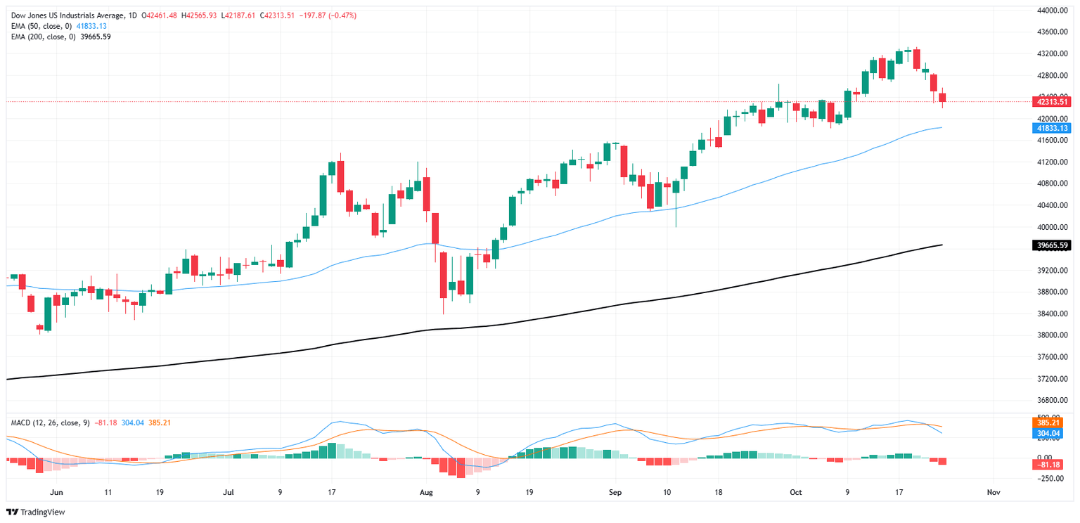 The Dow Jones Industrial Average (DJIA) daily chart reflects a bearish pullback after reaching a peak near 43,600. The index has dropped to 42,331, displaying a series of bearish candles as it approaches the 50-day EMA, currently at 41,833.