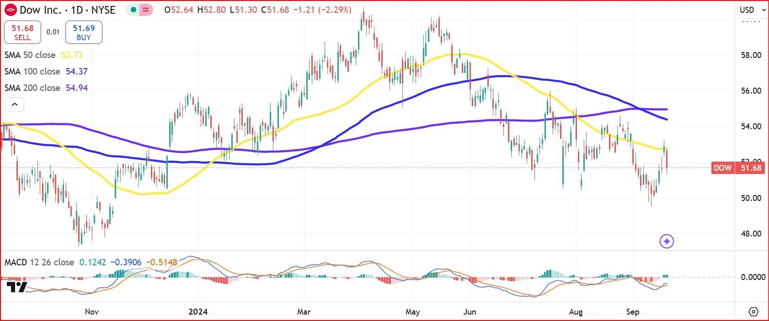 Dow (DOW), the holding company of Dow Chemical Company, was one of the worst-performing stocks in the Dow Jones Industrial Average (DJIA) on Friday. Shares sank 3% in the morning session before attempting a weak recovery by lunchtime.