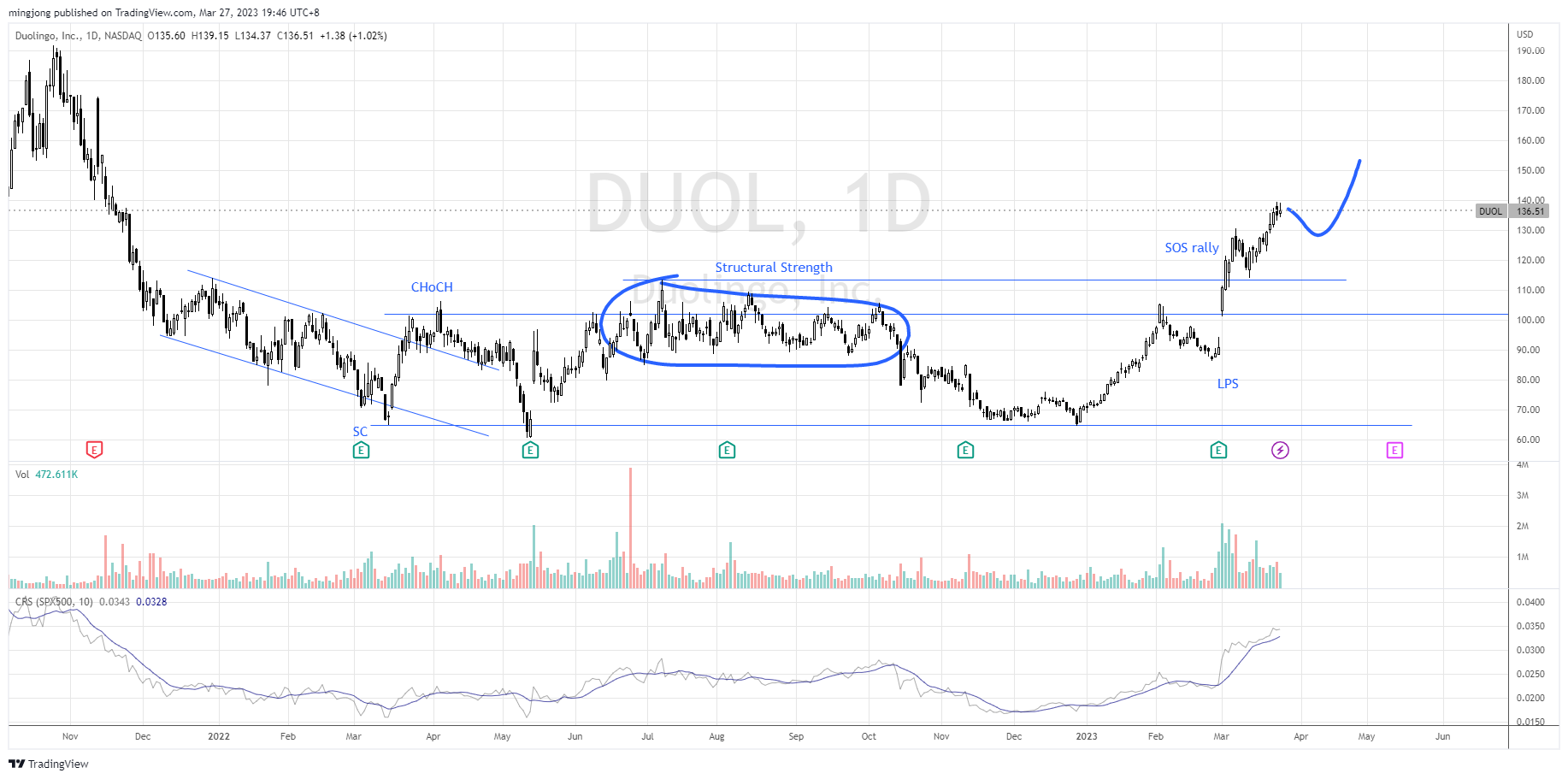 The price did one last leg down to test the low in late October to December of 2022 with low volume suggested exhaustion of supply. At the beginning of 2023, DUOL price had a localized Wyckoff spring then started a significant Wyckoff sign of strength (SOS) rally. It was the best rally and the pull back from resistance was shallow, forming the Wyckoff last point of support (LPS). This is the sign before a successful breakout of the Wyckoff accumulation phase. With earning results as catalyst, the price gap up above the $101.50 resistance and committed above it. This was accompanied by increased volume hinting at the presence of demand. The up trend took a momentary Wyckoff back up (BU) pullback forming a higher low at $114 before continuing on the phase E uptrend as tweeted below.