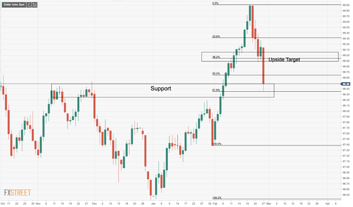 With fears of the coronavirus spreading, markets are now pricing in roughly three rate cuts from the Fed in 2020. The DXY is extending its downside correction on Thursday to complete a 38.2% Fibonacci retracement of the 2020 rally to a key support structure in the midpoint of the 98 handle. At the time of writing, DXY trades at 98.54 between a low of 98.36 and a high of 99.05, -0.62% on the day, so far.