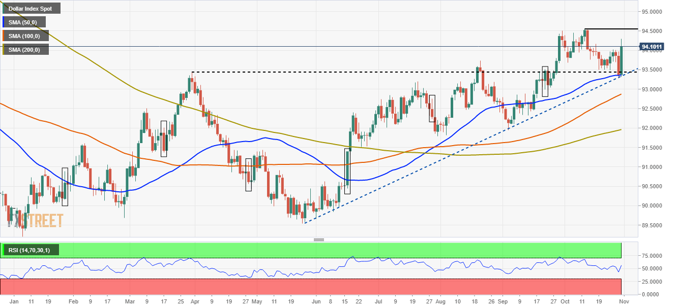- The US Dollar Index rose almost 1% during the day, printing a fresh weekly high at 94.30.